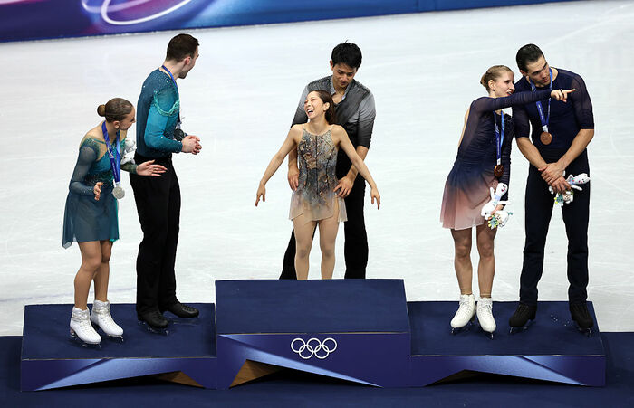 その様子に、銀メダルを獲得したアナスタシヤ・メテルキナ選手&ルカ・ベルラワ選手(ジョージア)、銅メダルを獲得したミネルヴァ・ファビアン・ハーゼ選手&ニキータ・ボロディン選手(ドイツ)も拍手を送り、思わずニッコリ。