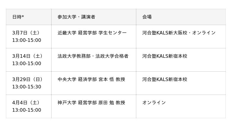河合塾グループの株式会社KEIアドバンスが運営する予備校「河合塾KALS」新宿本校・新大阪校は、 大学編入試験の受験を検討される方を対象に、東西の人気4大学の担当者をお招きした特別ガイダンス 企画「大学編入スペシャルWeeks」を3月7日(土)から5週連続で開催します。