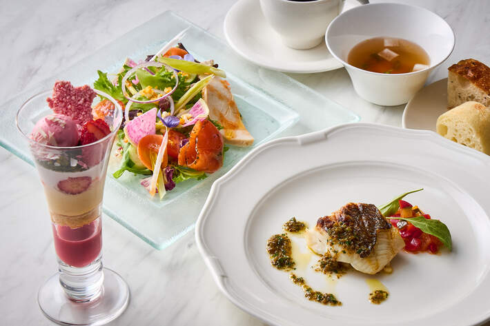 ケールや低カリウムレタス、根菜、山菜、ハーブに、蒸し鶏、サーモンを合わせた具だくさんプレートは、春の花畑をイメージして彩り華やかに仕上げました。自家製の野菜すりおろしドレッシングでお召し上がりいただく体に優しい一品です。メインは6種類の中からその日の気分でお好きなものをお選びいただけます。魚料理では、旬の“桜鯛”をグリルにし、ふっくらしっとりとした身と皮目のパリッとした食感をお楽しみいただけます。素材の旨みがより引き立つレモンとオリーブオイルをベースにした爽やかなソースでご賞味ください。肉料理は3種類ご用意し、豚肉は相性のよいトマトソースで、牛サーロインと牛フィレ肉は旨みが凝縮された濃厚なグレイビーソースでご堪能いただけます。締めくくりは、旬の苺と抹茶や和三盆など和のエッセンスを合わせ、アクセントにジュレやソース、アイスクリームに桜を取り入れた、春らしさを感じるこの時期ならではのパフェをご賞味ください。