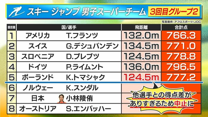 競技は第3ラウンドの途中、グループ2の5人目、ポーランド代表・トマシャク選手がジャンプを終えたあと、「他選手との得点差がありすぎる」などの要因で中止に。残すは小林選手を含むあと3人という状況でした。