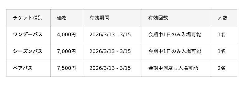 ※ワンデーパス及びペアパスは3/13-15のいずれかの1日のみ有効、シーズンパスは3/13-15の会期中何度もご入場頂けます。