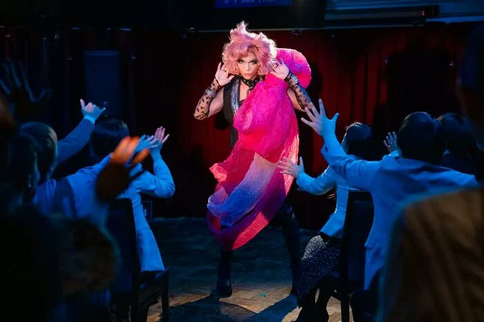 ドラァグクイーンショーでは、しなやかなダンスの動きと10センチヒールに苦戦
