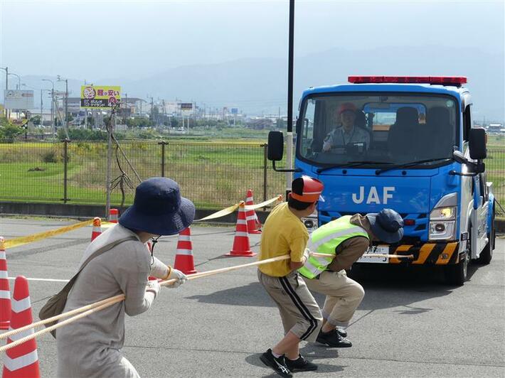 1.レッカー車と綱引き対決親子で縄を引いて、本物のレッカー車と綱引きします。