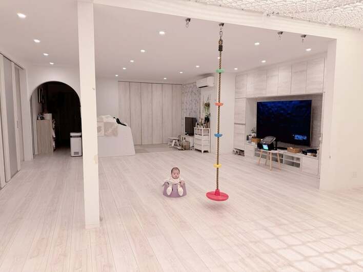 左側には、大きなアーチ型にくりぬかれた入口。右側には、奥に小さなテレビ、手前に大きなテレビと2台あります。天井からはロープが垂れ下がっていて、お子さんたちが元気よく遊べる空間になっていたことがうかがえました。
