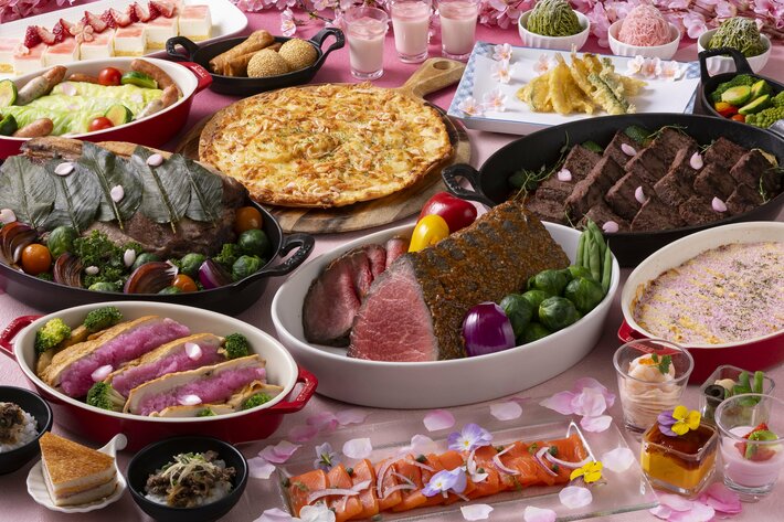「ブッフェダイニング ポルト」では桜味噌と糀でマリネしたローストビーフや桜色のモンブランなど春爛漫なメニューが並びます。「中国料理 満楼日園」のランチタイムでは、海老と烏賊を桜海老のXO醤で合わせた炒め料理や筍と鶏肉の蒸し物などが楽しめる桜華ランチをご用意。風味豊かに仕上げております。「和食 清水」のディナータイムでは桜豆腐や甘鯛の道明寺包み蒸しなど春を感じる料理を盛り込んだ「夜桜会席」をご堪能いただけます。