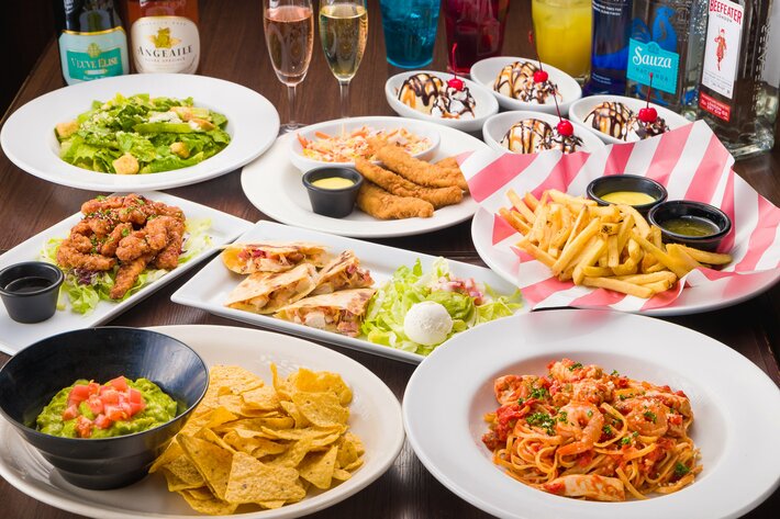 コブサラダ (ドレッシング シーザー/ ハニーマスタード) ・ブルスケッタ・チキン ケサディア ・バッファローウィング ・フライデーズ チーズバーガー ・フライデーズフライ ・ケイジャンシュリンプ&チキン パスタ ・ベイビーバックリブ ・コールスロー ・レッドブル飲み放題