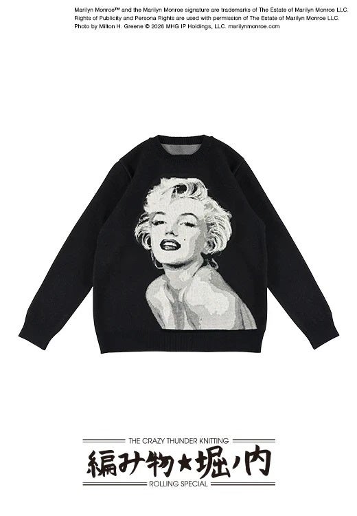 1950年代中頃に撮影されたマリリン モンローのポートレートをモチーフに、黒ベースのモノクロで表現したジャガード編みのニットセーター。