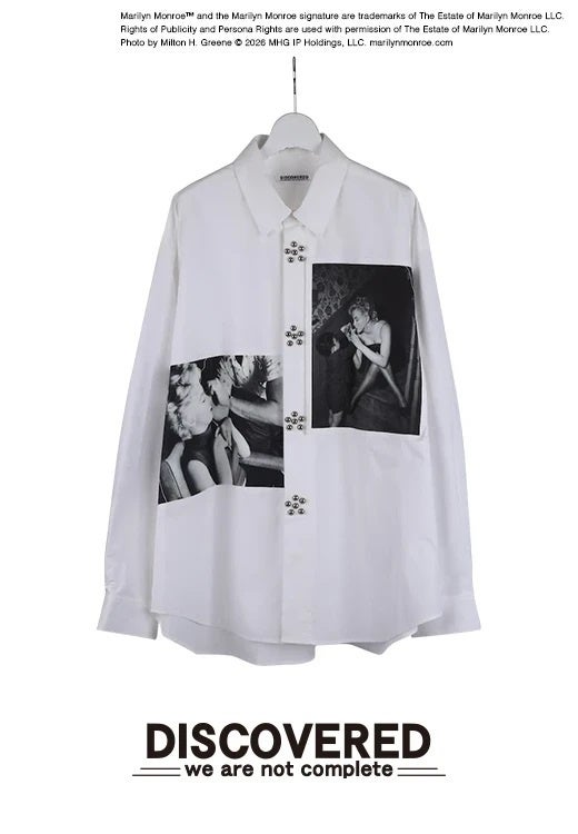 タテ糸の番手を太くし、後染めを施すことで通常より肉厚に仕上げたブロードを使用したレギュラーカラーシャツ。マリリン モンローの写真とランポーニスタッズがキャッチーかつ、インパクト抜群のアイテム。