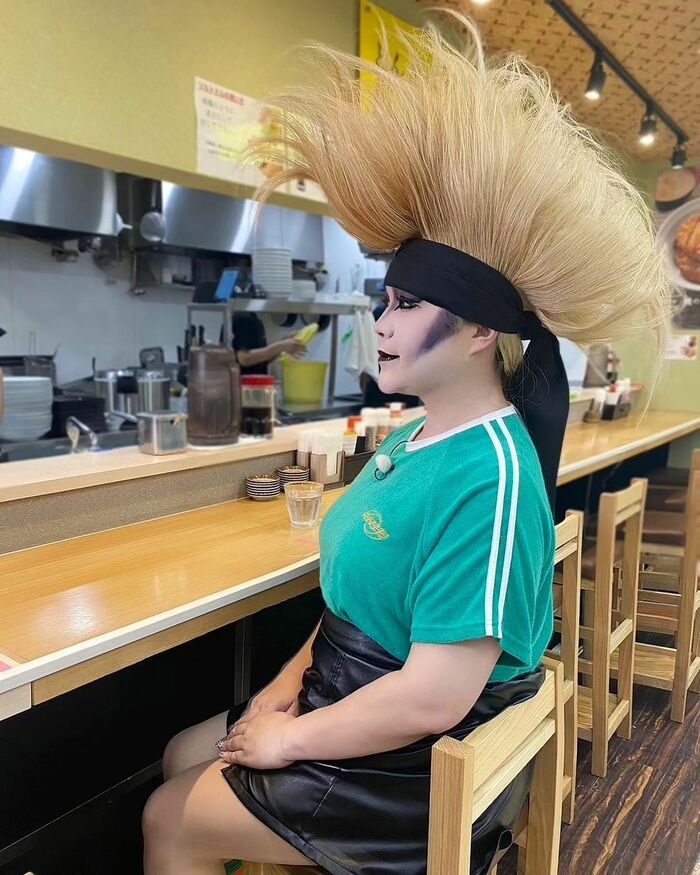 公開されたショットには、パンクスタイルな姿で、和風なとんかつ店の椅子に座り横顔見えるショットや…。
