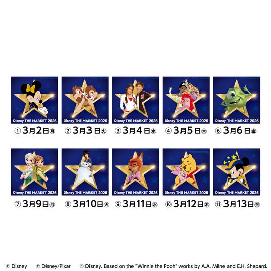 日替わり!お買いあげノベルティ期間中『Disney THE MARKET 2026 in銀座三越』会場にて税込3,000円以上お買いあげいただいた各日先着100名様に「三越伊勢丹限定 日替わりステッカー」をプレゼントいたします。