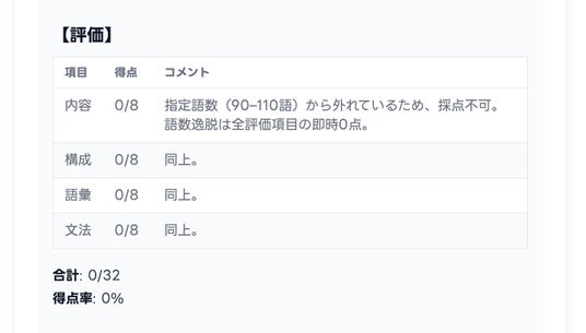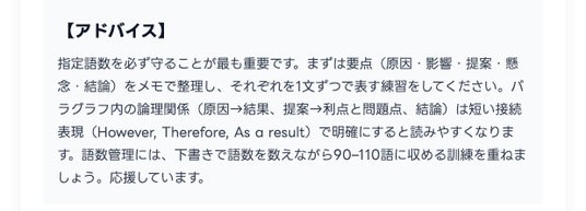 A. 本番で要件未達により大きく失点するリスクがある以上、練習段階で曖昧にせず、「語数を守ることを最優先で身につける」設計が必要だと判断しました。なお、語数逸脱で0点となった場合でも、次回改善につながるよう修正点・改善の方向性を提示します。