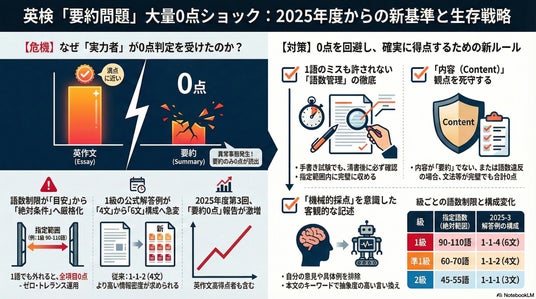 近年の英検(R)では、要約問題の指示文が「語数の目安」ではなく、語数の範囲(指定語数)を明確に示す形式へ変更されています。そして、昨日2月17日の2025年度第3回検定の一次試験Web合否公開後、要約が0点になったという報告がSNS等で相次ぎ、指定語数からの逸脱が要因の一つとして指摘されています。