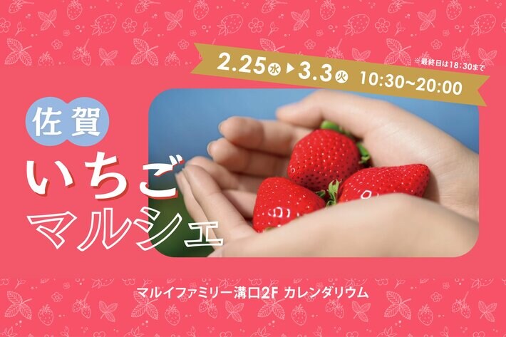 マルイファミリー溝口(株式会社丸井、本社:東京都中野区、代表取締役社長:青野 真博)2Fカレンダリウムにて、産地直送ECサイト「ポケットマルシェ」を運営する株式会社雨風太陽と共催で、佐賀県のブランドいちごやいちごスイーツが勢揃いするイベント「佐賀いちごマルシェ」を2月25日(水)~3月3日(火)の期間限定で実施いたします。