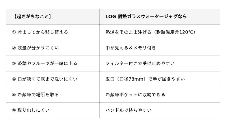 冷水筒の困りごと6選|LOG耐熱ガラスジャグならこう変わる
