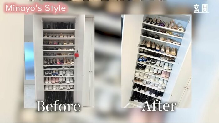 両サイドには天井までのびた大きな靴箱があり、片側は渡辺さんの長男・矢島愛弥さんと次男・矢島名月さんの靴がズラリ。きれいに片付けられていて気持ち良い見栄えです。
