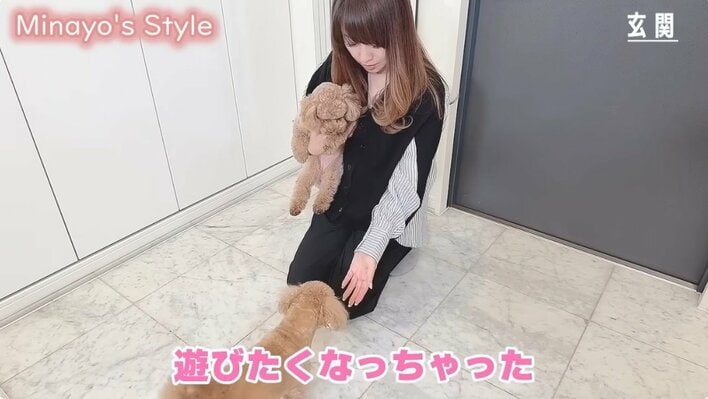まずは、愛犬ココちゃんを抱えながら、広々とした玄関を紹介。