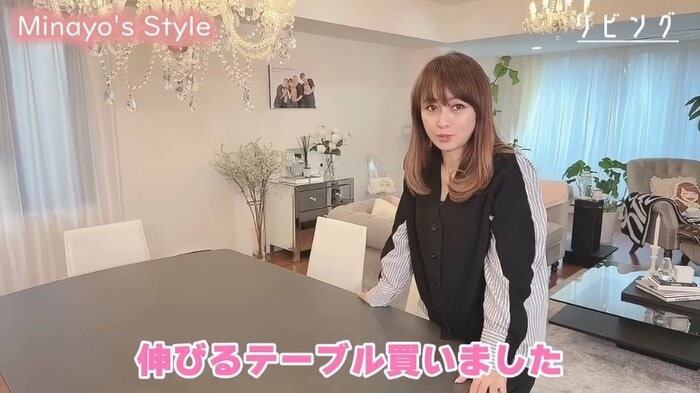 さらに、新調したというグレーのダイニングテーブルに手を添え、「我が家は大勢集まるので、なるべく大きなやつをと思い伸びるテーブルを買いました」と報告。