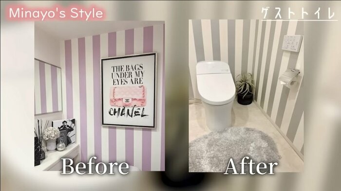 パープルの壁は、トイレとは思えないほど可愛らしく、ポップな雰囲気。対して模様替え後のシルバーの壁は、シックで落ち着いた印象を受けます。小さな観葉植物も置かれており、清潔感にあふれていますね。