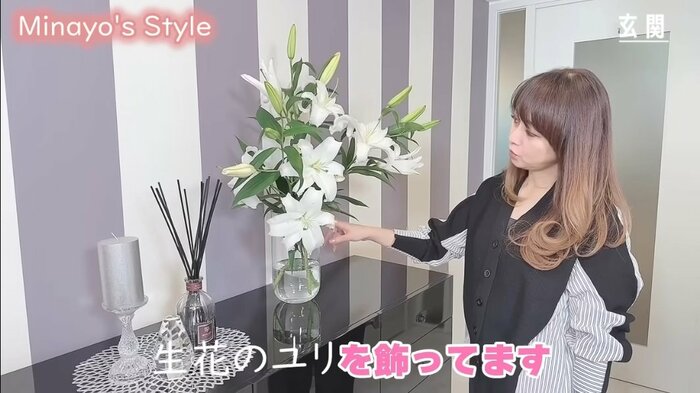 白を基調した玄関で最も目を引くのは、重厚感あふれる漆黒の棚。上には、ディフィーザーやキャンドル、ガラスの花瓶に生けた真っ白なユリが飾られています。