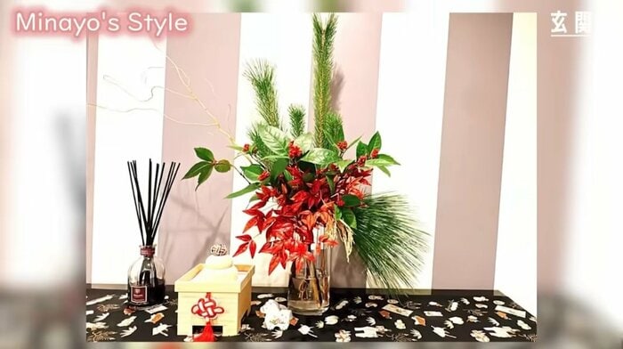 模様替え前は正月花が飾られていたようですが、花を変えることで空間の雰囲気が一気に変わり、気品漂う玄関に仕上がっています。