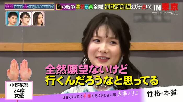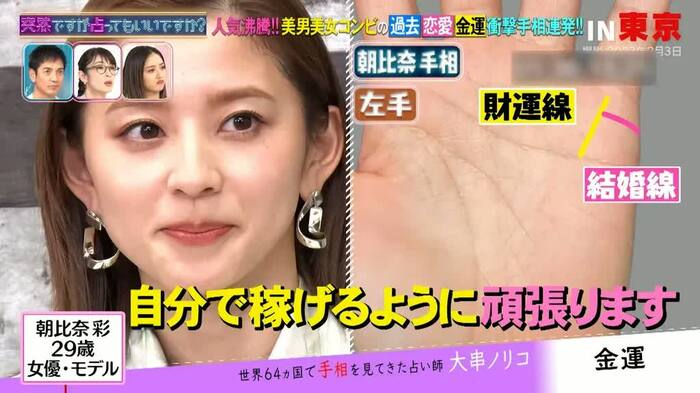 一方の朝比奈さんは、大串さんによると「玉の輿相。男の人に食べさせてもらえる手相」だそうで、朝比奈さんは「自分で稼げるように頑張ります」と答えました。