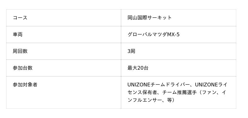 今回、UNIZONE 2026リーグ開幕戦ではエキシビションレースの開催を予定しております。このエキシビションレースには、各チームの参加選手だけでなく、UNIZONEライセンス保有者や、各チームが推薦するファンの代表者やインフルエンサー等も参戦する、最大で合計20台でのこれまでにない新しい交流戦となります。