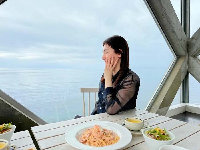 別の写真では、窓の外に広大な海が広がるテーブル席で、パスタの皿を前に微笑む野々村さんが写っています。頬に手を当てたポーズで、落ち着いた中にも好奇心を感じさせる表情がとても魅力的です。エビやイカなどが入った魚介のクリームパスタが彩りを添え、思わずお腹が空いてしまいそうな一枚です。