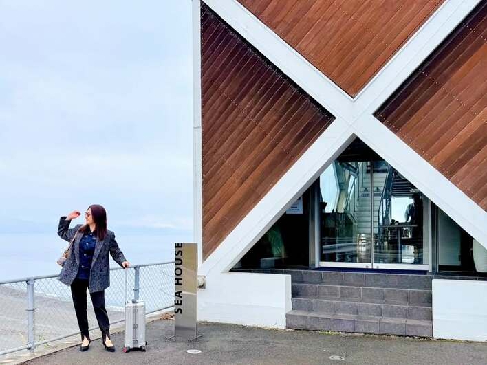 投稿された写真には、太平洋を一望できる高台のレストランの前で、キャリーケースを片手に佇む野々村さんの姿が写し出されています。