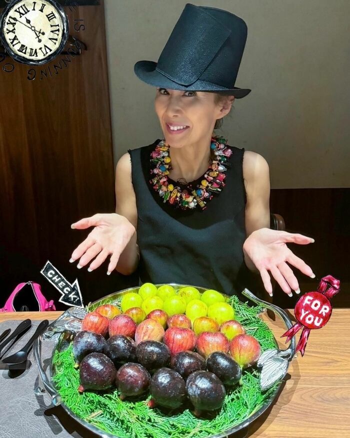 黒いハットに黒いワンピース姿でオシャレな秋コーデを披露した萬田さんは、「秋だわ〜 オシャレっちゃいましょ」というコメントと共にお皿にズラリと並べられた秋の味覚“いちじく”を紹介しているのですが、そんな萬田さんの首元にはなにやら豪華な首飾りが…。