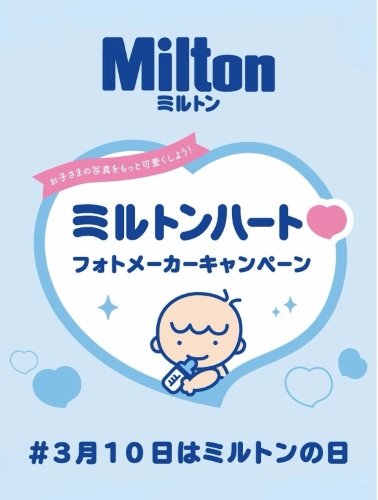 この「ミルトンの日」を記念して、赤ちゃんの写真でオリジナルのCM風画像を作成できる「ミルトンハート(ハート)フォトメーカーキャンペーン」を実施しています。