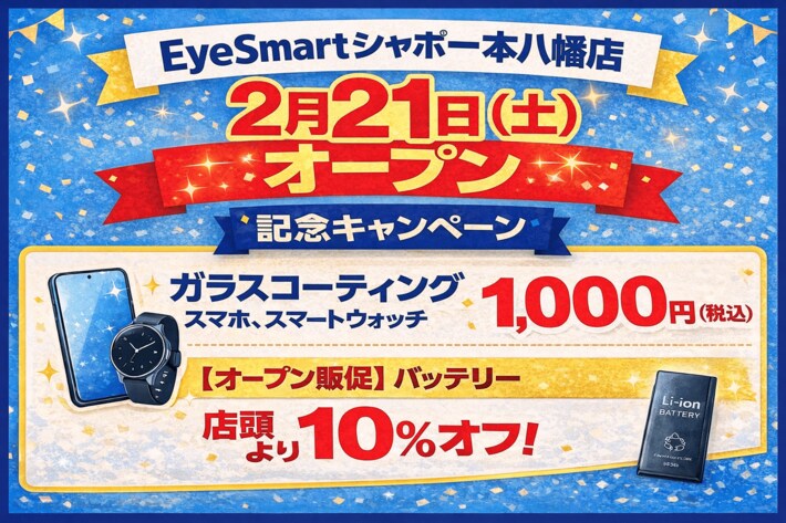 iPhone修理・パソコン修理のEyeSmart株式会社(本社:千葉県八千代市/代表取締役:小野 寛幸)は、2026年2月21日(土)から【iPhone修理・パソコン修理のEyeSmart シャポー本八幡店】をオープン致します。