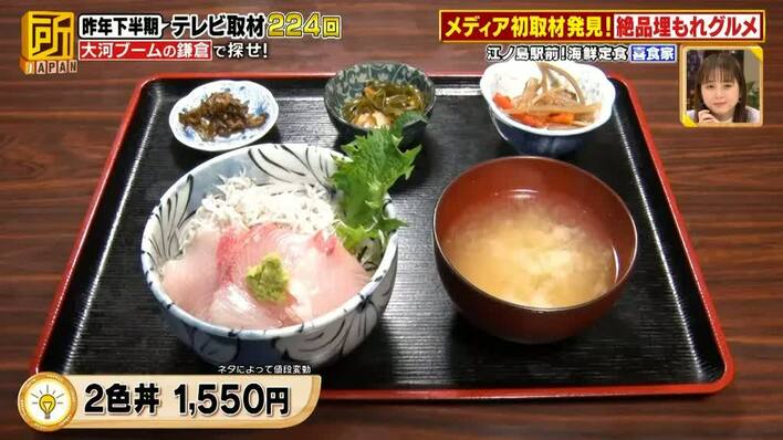 そんな江ノ島駅前で埋もれていた絶品グルメは、釜揚げしらすと旬の刺身を同時に味わえる「2色丼」(1550円/ネタによって値段変動)。
