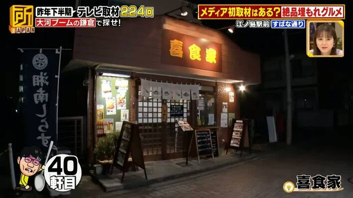 飯尾さんが、ロケ開始から8時間11分、40軒目で見つけたのが、江ノ電江ノ島駅前にある、創業19年の「喜食家」。