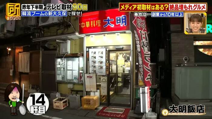 大久保さんが、ロケ開始から3時間23分、14軒目で見つけたのが、新大久保駅の西側にある、創業50年の「大明飯店」。