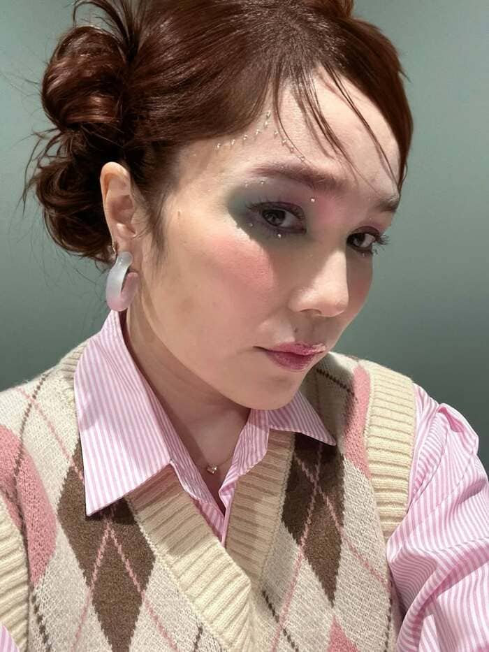 まつげがしっかりと上がった目元には、水色のアイシャドーに加え、キラキラとしたストーンが施されています。そしてアップにした髪はリボンのようにスタイリングされていて、とってもキュート。