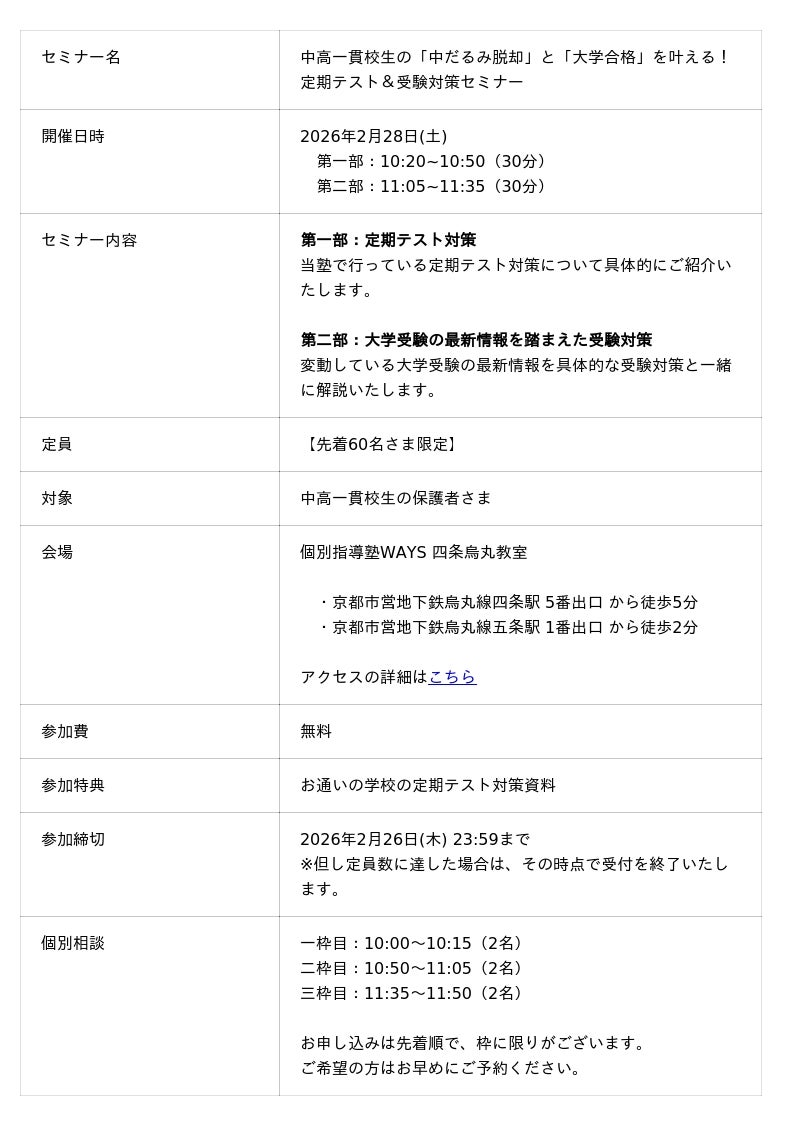 中高一貫校専門 個別指導塾WAYS(運営:株式会社メイツ、本社:東京都新宿区)は、2026年2月28日(土)、四条烏丸教室にて、中高一貫校に通う中学生・高校生の保護者様を対象とした『中高一貫校生の「中だるみ脱却」と「大学合格」を叶える!定期テスト&受験対策セミナー』を開催いたします。