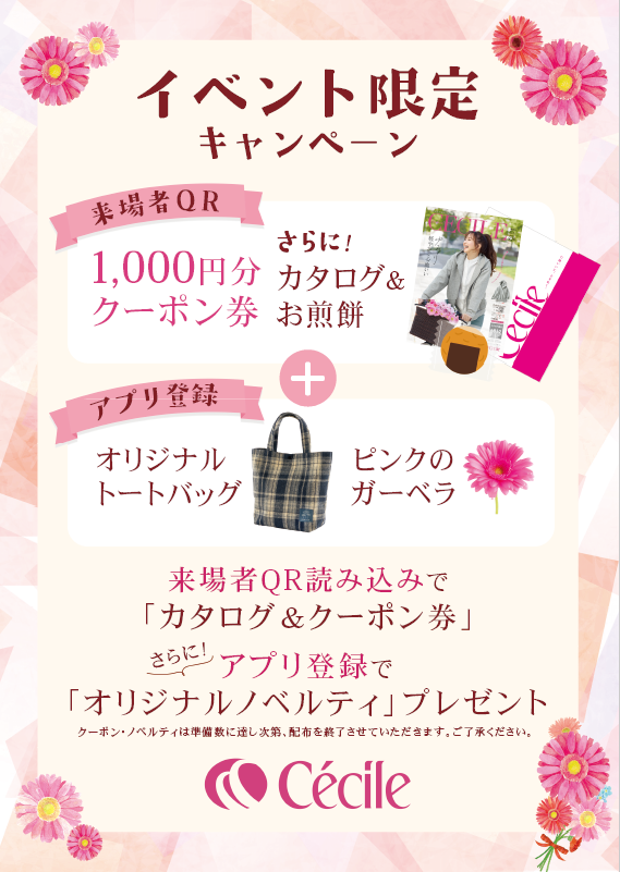 セシールの出展ブースでは、会場でのQRコード提示にて1,000円分クーポン、カタログ、草加せんべいをお渡しいたします。さらにセシールの公式アプリにご登録いただくと、オリジナルトートバッグとピンクのガーベラをプレゼント。来場者向けのサンプリングとして、セシールのチラシを同封し、講演ステージでは当社のCMを上映予定です。会場限定の特典や展示を多数ご用意しています。ぜひこの機会にセシールブースへお越しください。