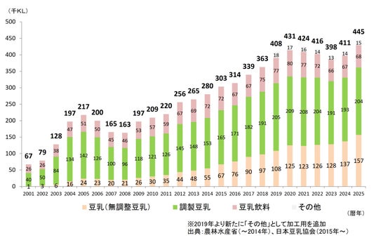 2025年の豆乳の国内生産量は、過去最高の44.5万KLでした。