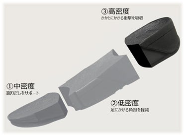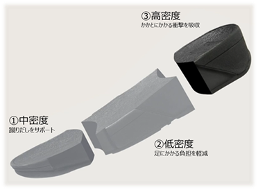 体圧分散: 中央の低密度層が足裏にかかる圧力を分散し、