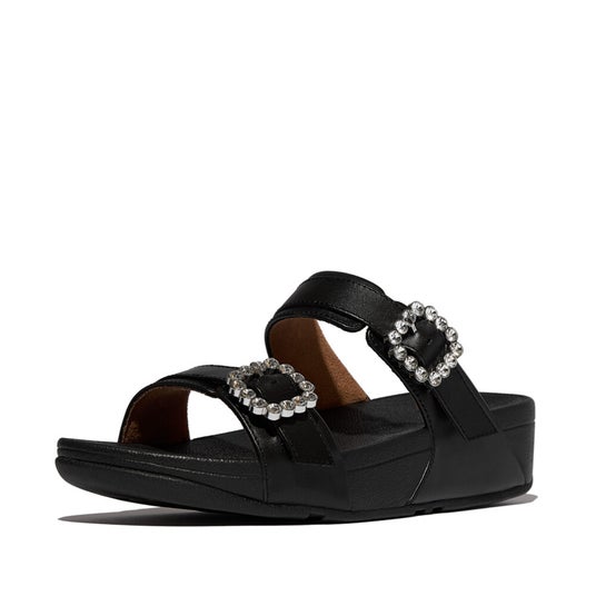 LULU CRYSTAL-BUCKLE LEATHER SLIDES