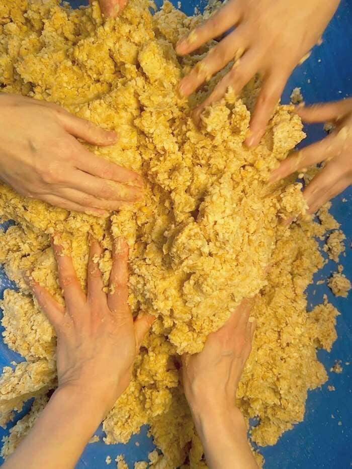 続く写真では、つぶされた大量の大豆と塩きり麹を両手でしっかりと力強く混ぜ合わせている手元が。