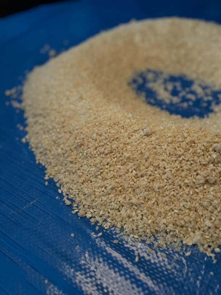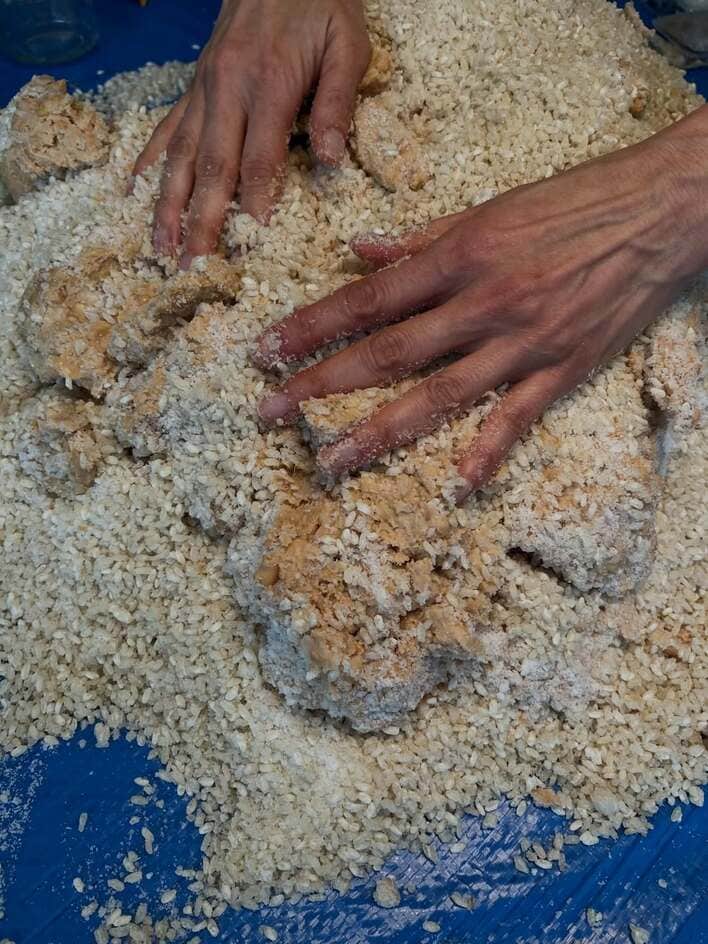 投稿された写真には味噌造りの様子がひとつひとつ映されていて、まずは青いビニールシートの上に、麹と塩を混ぜたベージュ色の塩きり麹が円弧を描くように広がる作業前の写真からはじまります。