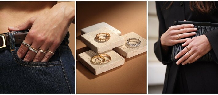 リングは重ねづけを前提に設計しており、複数本を組み合わせることで立体感や奥行きを演出します。すべてフランス国内のアトリエにて受注生産され、メゾンのクラフツマンシップが、一点一点に丁寧に息づいています。