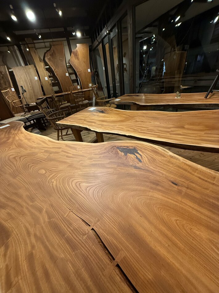同じ一本の丸太から生まれた「分身」。長野市で育った巨木が、三枚のテーブルとして並ぶ壮観。一枚板の世界において、これほど贅沢な出会いはありません。 「共木(ともぎ)」とは、同じ一本の丸太から製材された、隣り合う板のこと。