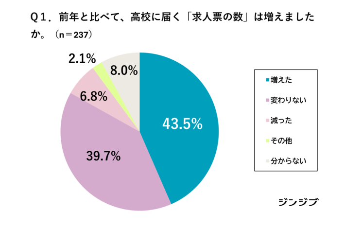 高校生の就職活動を支援する「ジンジブ」(大阪市)は、進路指導に携わる全国の高校教員を対象にアンケート調査を実施いたしました。(有効回答237名)