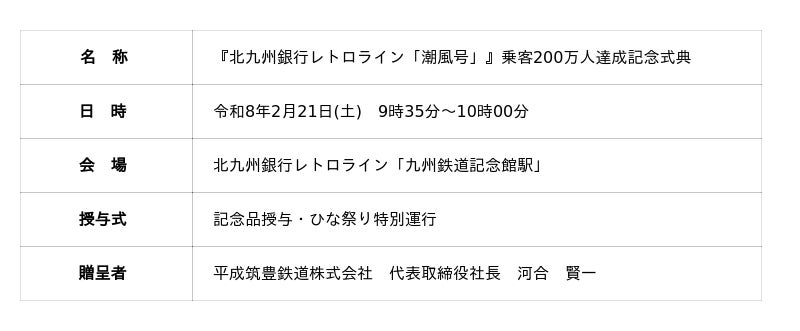これを記念して、下記のとおり、「潮風号」乗客数200万人達成記念式典を開催いたします。