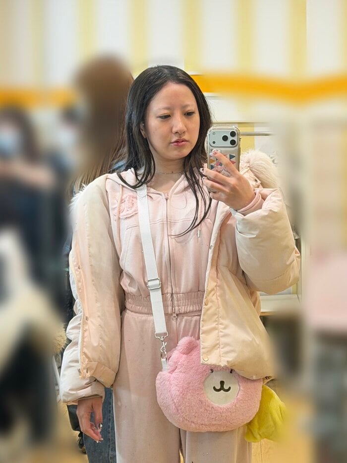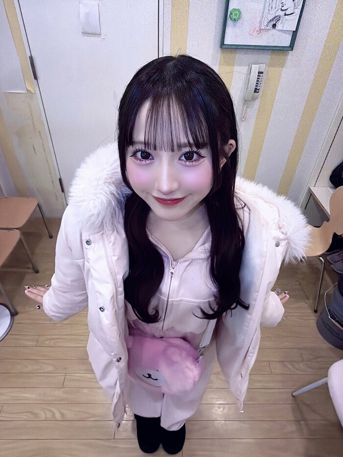 写真では、ピンクのジャージに淡いピンクのダウンジャケットを羽織り、くまモチーフのファーバッグを肩に掛けたスタイルを披露。やや俯瞰気味のアングルで撮影された“彼氏目線”ショットとなっており、カメラを下から見上げるような視線が印象的です。