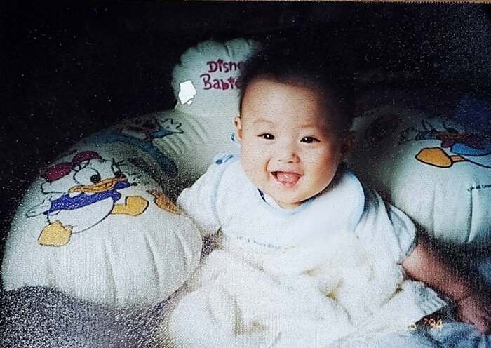 公開された写真には、ディズニーキャラクターが描かれたクッションの間に座る、幼い頃の八木さんの姿が。