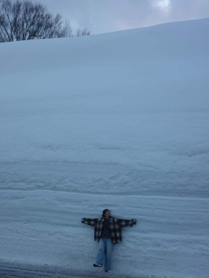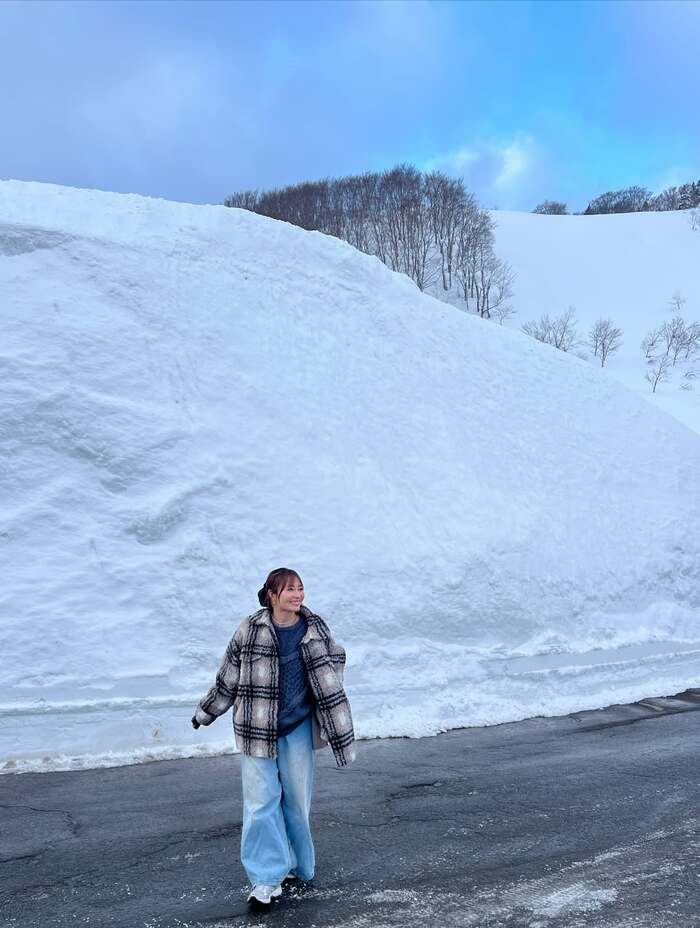 別のカットでは、圧倒されるほどの高さに積み上がった雪の壁を前に、両手両足を大きく広げる姿も披露。その雪は新山さんの身長の4倍はあろうかという迫力で、思わず目を奪われます。