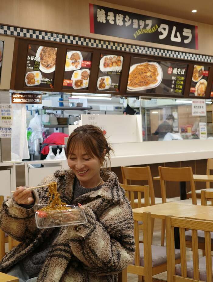 ローカルな雰囲気が漂うフードコートでは、透明の容器に入った焼きそばを箸で持ち上げるショットも披露。どこか懐かしさをかみしめるような笑みが印象的で、ふるさとを満喫する様子が伝わってきます。